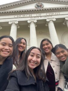 group of friends in front of a church of christ worship building