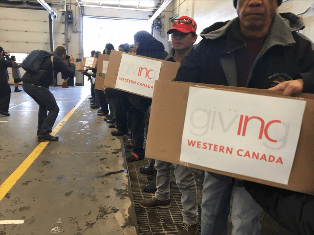 assembly line of people passing boxes of donations with "INC Giving" written on boxes