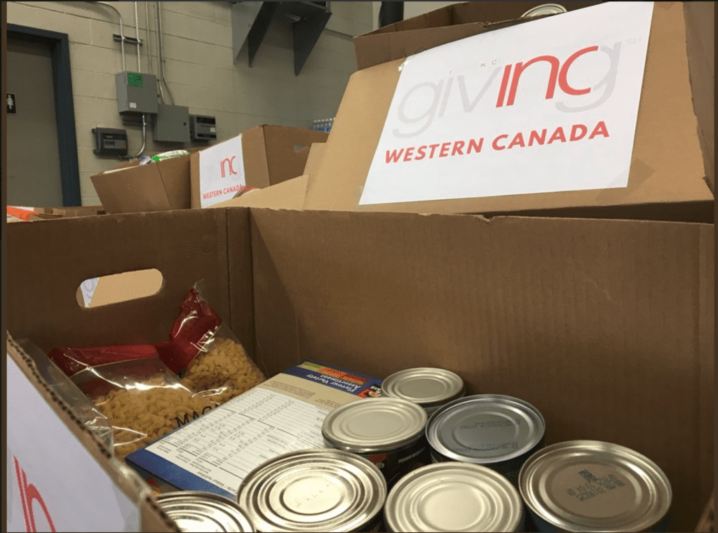 assembly line of people passing boxes of donations with "INC Giving" written on boxes