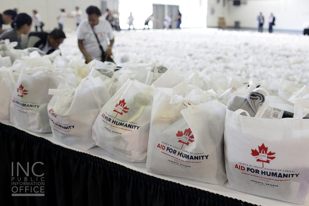 The day before the chapel dedication, members of the INC in Toronto and surrounding areas also participated in an Aid For Humanity event through the Felix Y. Manalo Foundation. Over 3000 care packages were prepared for the homeless, refugees, new immigrants, as well as clients at local shelters. Filled with winter wear items, including blankets, mittens, socks, as well as food items and hygiene products, these care packages were given out along with free food and entertainment at an event at the Queen Elizabeth Building at Exhibition Place in Toronto.