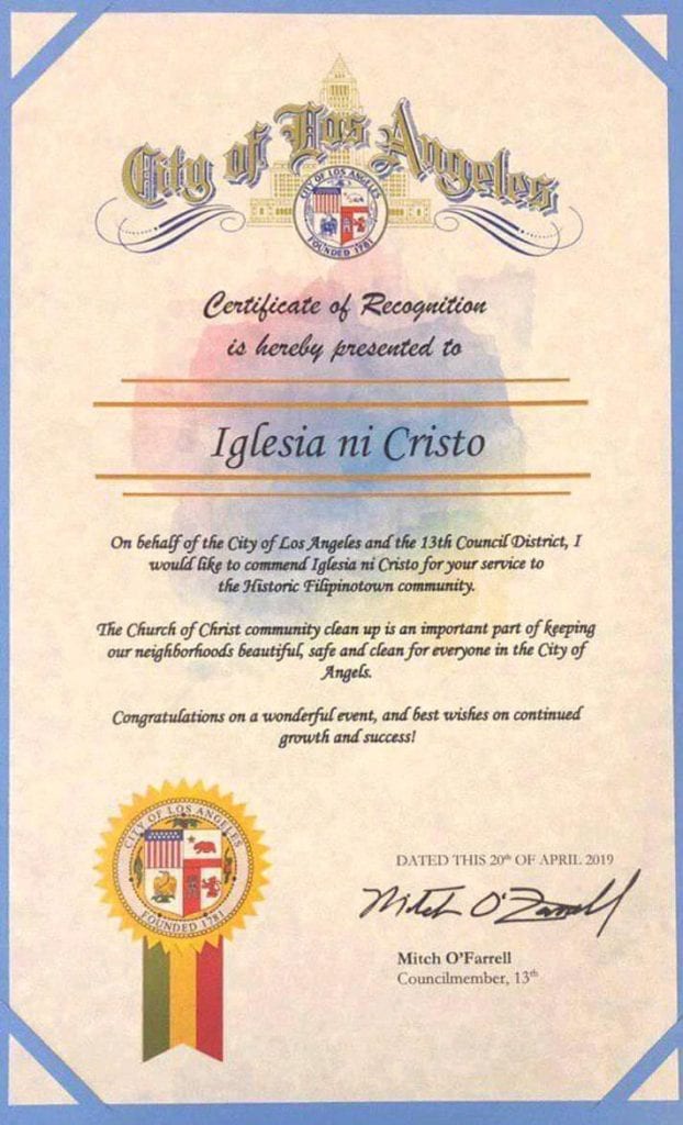 LOS ANGELES (May 7, 2019) – Local congregations of the international religious organization Iglesia Ni Cristo (INC or Church Of Christ) were recognized by the City of Los Angeles on April 27, as an acknowledgment of the INC’s public service to the Historic Filipinotown Community.