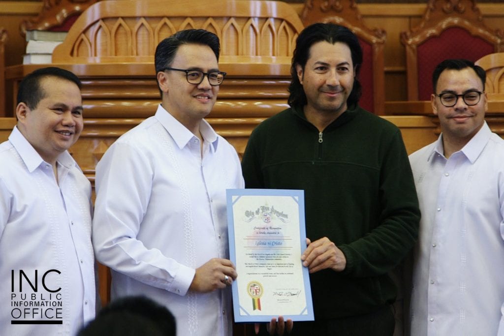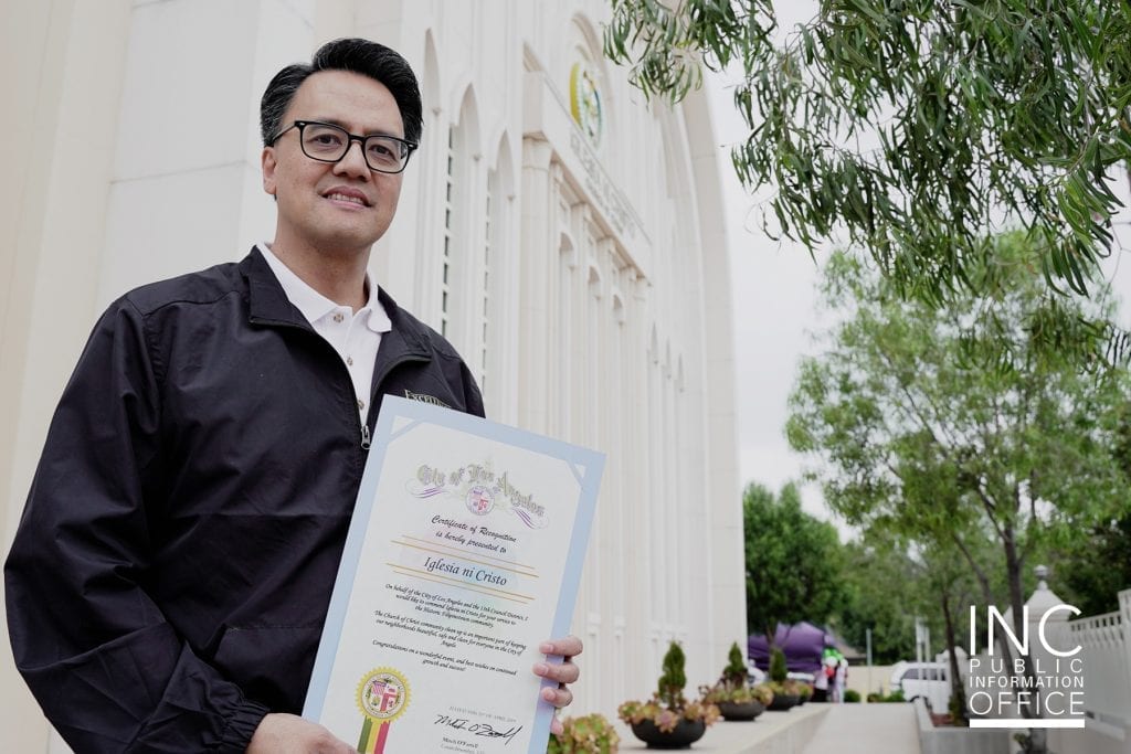 “There are a lot of bad things going on in the world today, so we put into practice our faith and want the community to feel the love and care, the presence of the Church Of Christ,” said Brother Dennis Dulay, District Supervising Minister overseeing the Los Angeles County INC congregations, upon receiving the certificate.